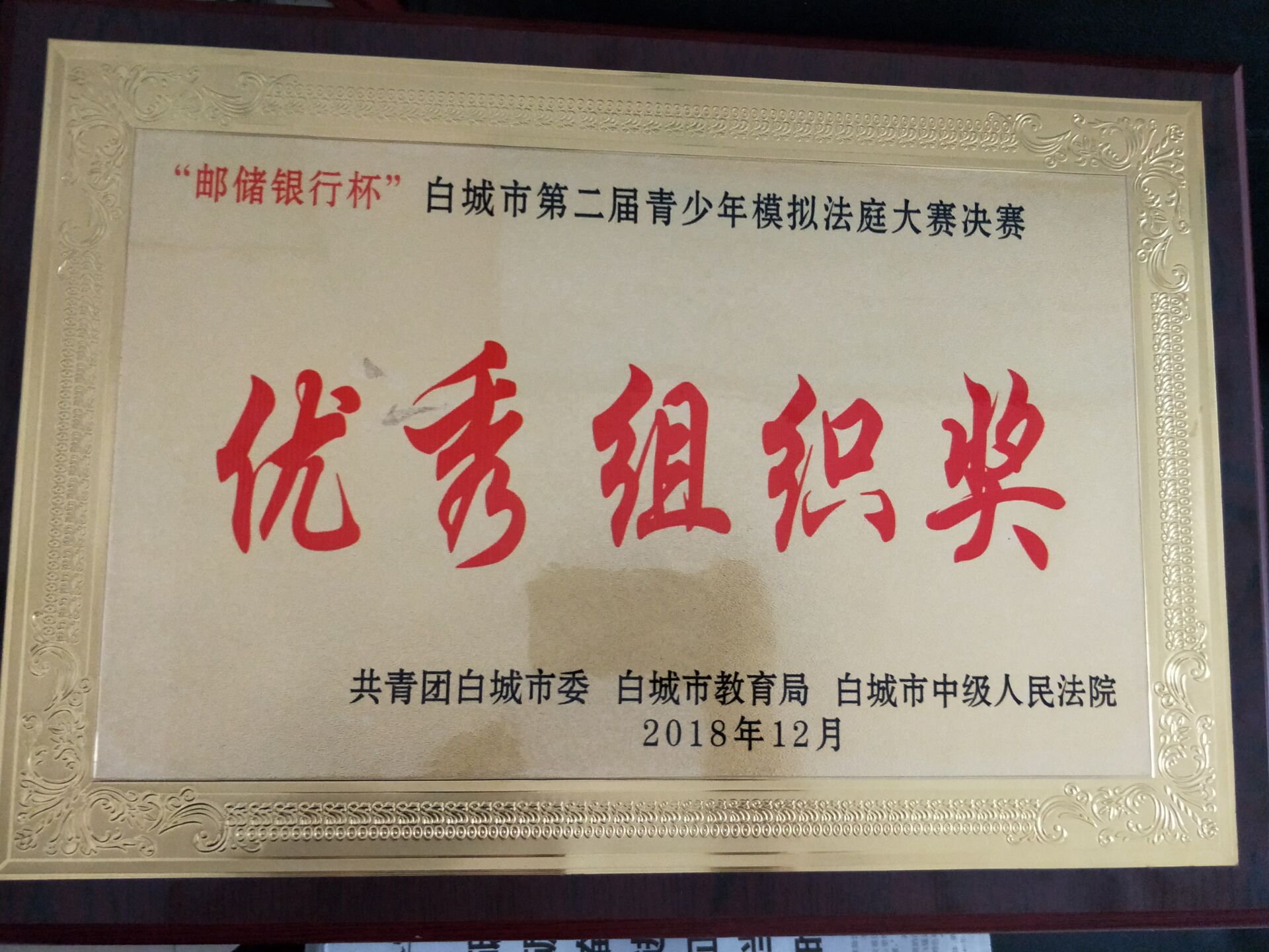 2018年 白城市第二届青少年模拟法庭大赛决赛优秀组织奖