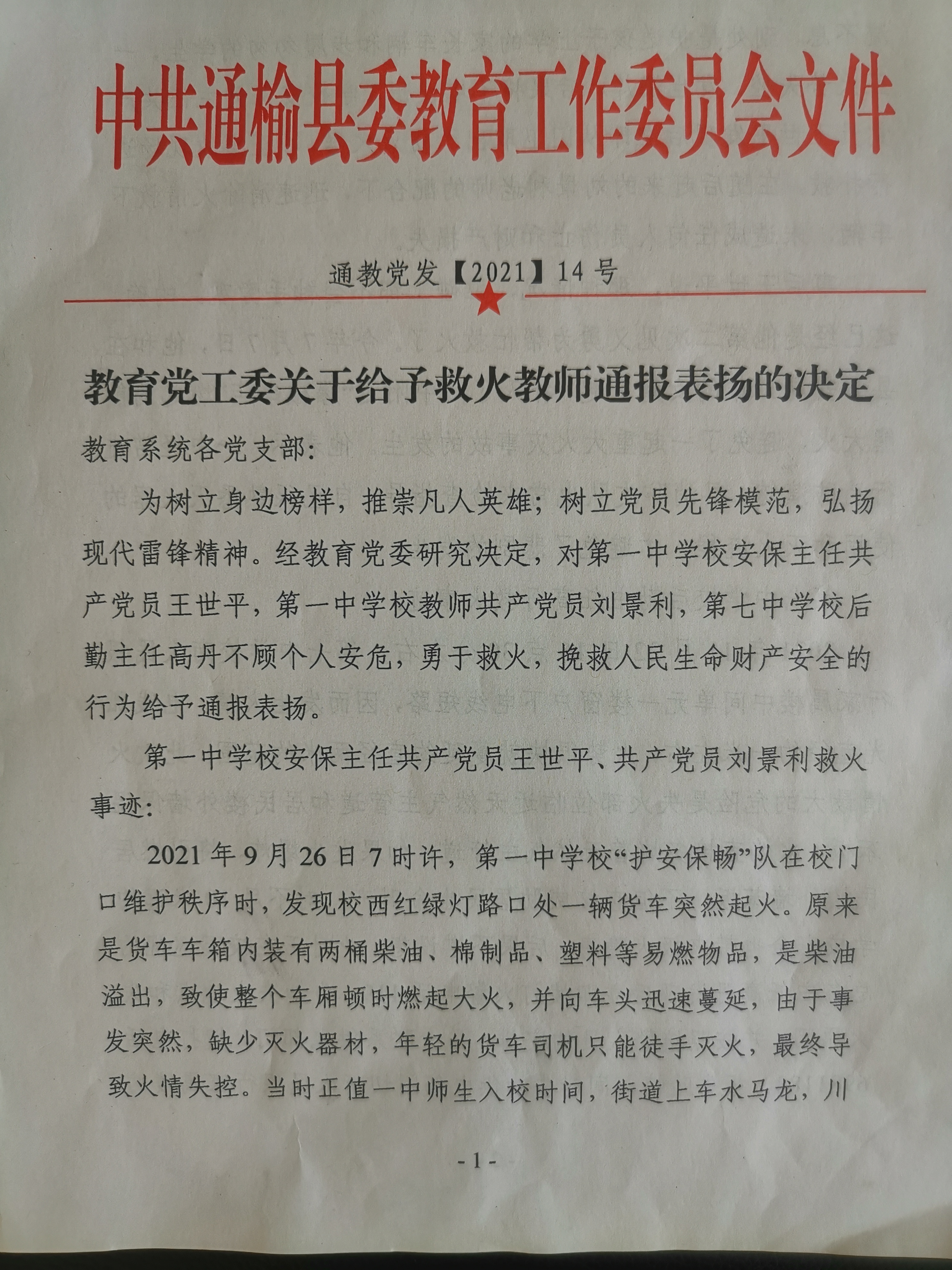 2021年教育党工委关于给予救火教师通报表扬的决定