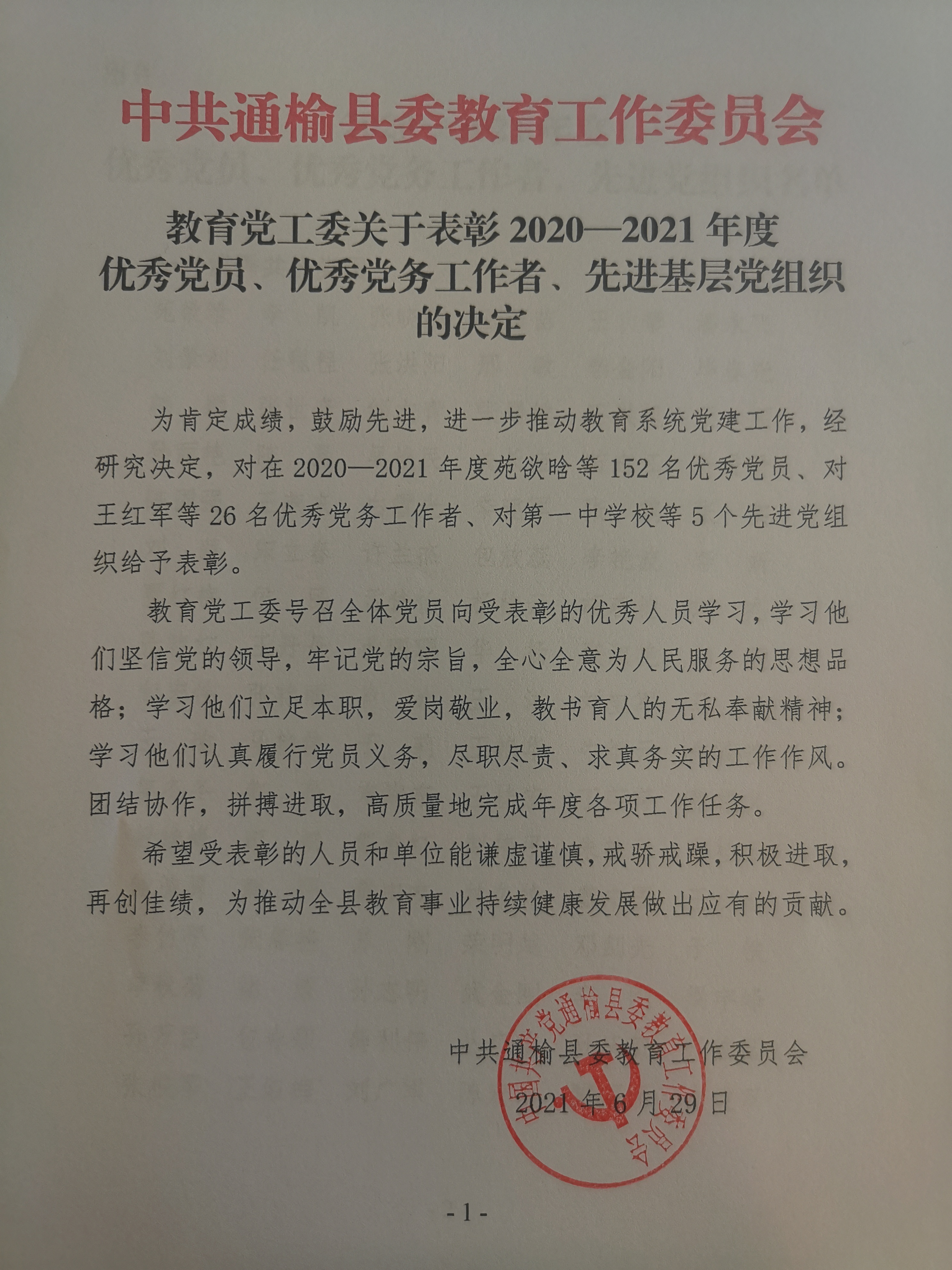 教育党工委关于表彰2020-2021年度优秀党员、优秀党务工作者、先进基层党组织的决定
