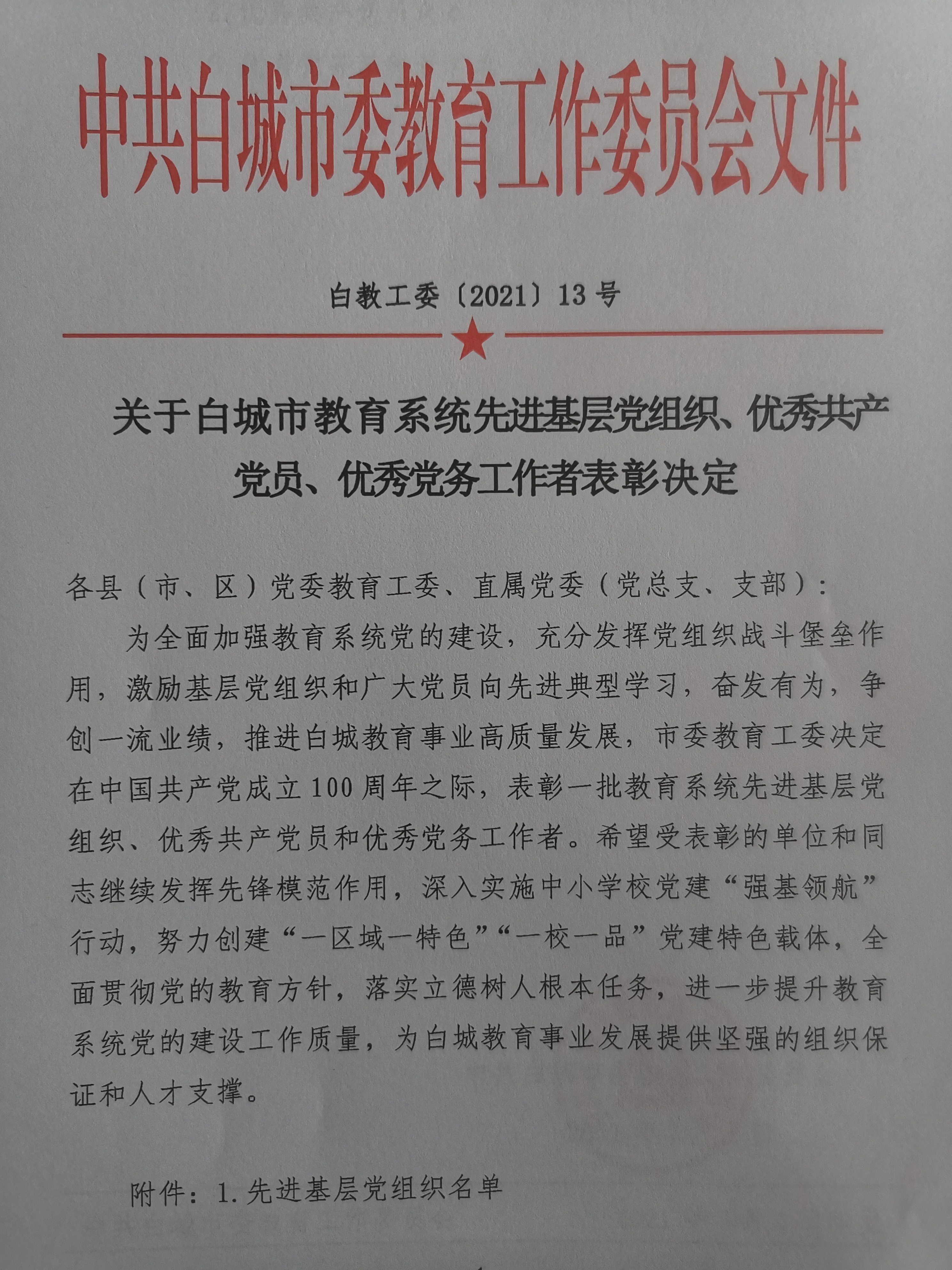 关于白城市教育系统先进基层党组织、优秀共产党员、优秀党务工作者表彰决定