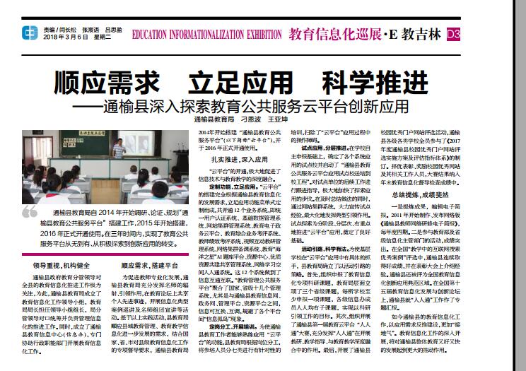 2018年3月6日通榆县教育信息化工作传来喜讯——《E教吉林》报刊头版头条图文报道了通榆县深入探索教育公共服务云平台创新应用典型做法。