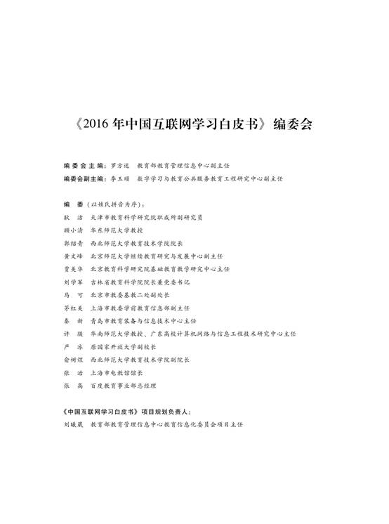 《白皮书》由教育部教育管理信息中心、百度文库发起并主持编写,国内一线专家和实践者共同参与,旨在通过数据多维度、多视角解读当前不同教育领域用户群体的互联网学习行为和状态,同时结合各代表性区域学校和优秀企业的实践案例,展现技术融入教育的前瞻性实践和真切的发展进程。《白皮书》自2014年起每年出版一次,作为互联网学习方面唯一的官方文件,受到了社会各界的广泛关注。2016年的《白皮书》涵盖了互联网学习发展概述、互联网学习发展现状、融合实践背景下教育教学新发展以及互联网学习发展年度案例、关键问题、发展趋势等内容。