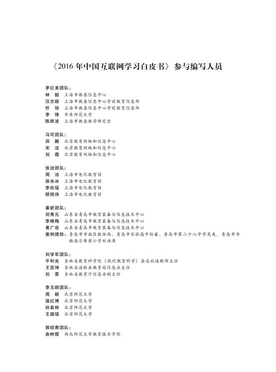 作为吉林省教育研究领域的代表,省教育科学院刘学军院长受邀参与了此次编写工作,并以编委和吉林省团队负责人的身份负责了《吉林省基础教育互联网学习发展》部分的编写。该团队成员有吉林省教育科学院《现代教育科学》通联部主任平和光、吉林省通榆县教育局信息办主任王亚坤、吉林省教育厅信息办副主任刘雷。