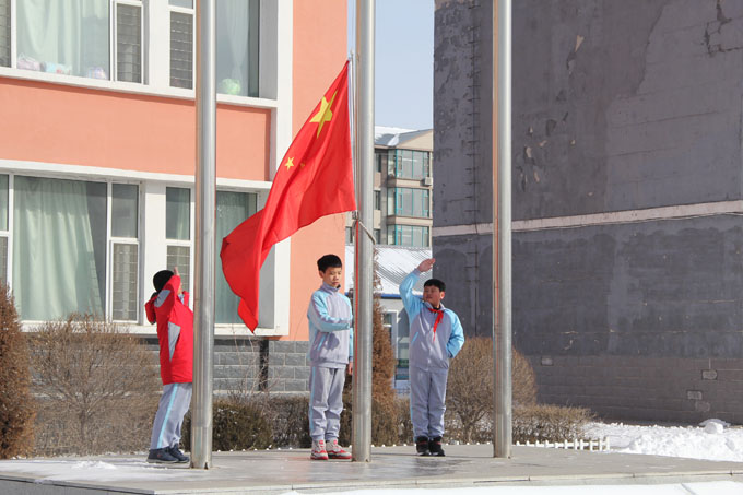 庄严的升旗仪式上,同学们整齐列队,红领巾在胸前飘荡。当雄壮的国歌声徐徐奏响,当五星红旗冉冉升起,同学以昂扬的姿态、坚定的信念、无畏的精神迎接新的挑战。学生的国旗下讲话铿锵有力,要求自己也提醒大家:守则规范记心中,争做当代好少年。大队辅导员在新学期为同学们加油、鼓劲。希望同学这一棵棵小树苗能在春天里茁壮成长。
